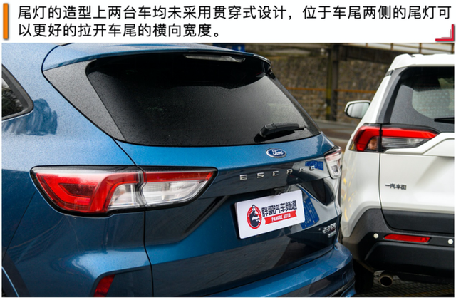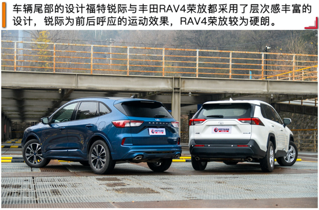 车辆尾部的设计福特锐际与丰田RAV4荣放都采用了层次感丰富的造型,锐际车辆尾部的造型与车头形成前后呼应的效果,RAV4荣放则是延续了整车较为硬朗的风格。车辆底部两台车都采用了双边共双出的排气管,锐际为方形设计荣放则为圆形设计,从设计上来看的锐际的造型会更耐看一些。
