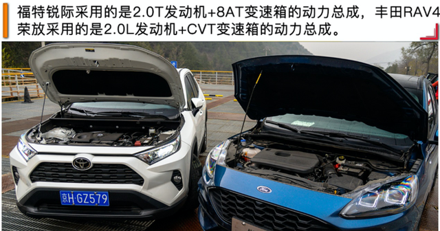 动力系统方面福特锐际采用了2.0T发动机+8AT变速箱的动力总成,最大功率248匹马力,峰值扭矩393牛·米,丰田RAV4荣放则是采用了2.0L发动机+CVT变速箱的动力总成,最大功率171匹马力,最大扭矩209牛·米,所以单从数据上来看福特锐际可以说是完胜。