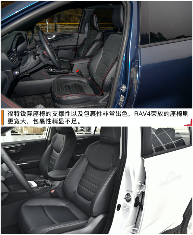 福特锐际作为一款主打运动的车型,座椅的支撑性以及包裹性非常出色,而RAV4荣放的座椅则更为宽大,相比之下包裹性不如锐际,但舒适性会稍好一些。