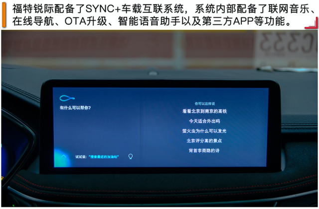 互联系统方面福特锐际配备了SYNC+车载互联系统,系统内部配备了联网音乐、在线导航、OTA升级、智能语音助手以及第三方APP等功能,UI界面采用横向布局的形式,指尖轻触屏幕左右滑动即可查看不同功能,用法与智能手机没有差异。