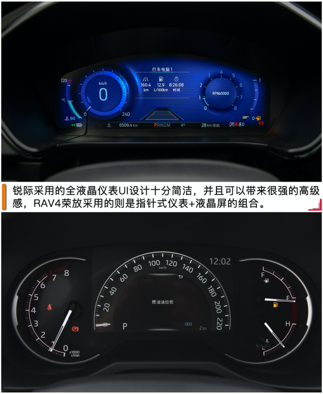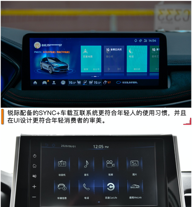 两款车型同样是采用的三辐多功能方向盘,整体握感上锐际更为饱满。锐际采用的全液晶仪表UI设计十分简洁,并且可以带来很强的高级感,RAV4荣放采用的指针式仪表+液晶屏的组合,综合来看的话锐际更胜一筹。而两台车的车载互联系统无论是从屏幕尺寸、UI界面还是功能来看,锐际配备的SYNC+车载互联系统更符合年轻人的使用习惯,并且我们本次的试驾车还在车内配备了B&O的品牌音响。