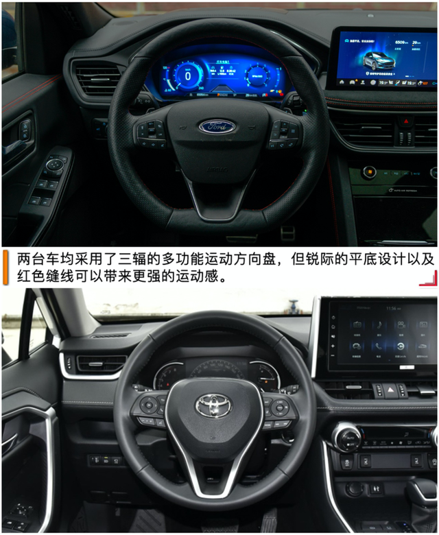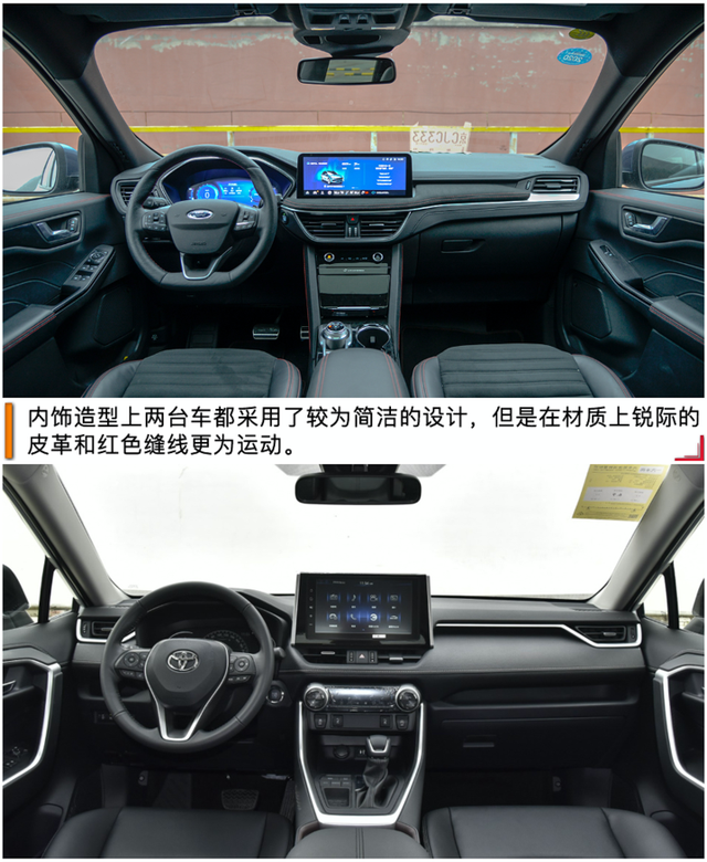 内饰的设计上美系车与日系车完全是两种不同的设计风格,虽然两台车都采用了较为简洁的设计,但是福特锐际内饰却应用了例如皮革、钢琴烤漆、红色缝线等材质,而丰田RAV4荣放则是更为注重实用性的设计,虽然也应用了一定的皮革材质,但在整体的视觉效果上要比锐际略逊一筹。