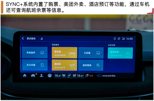 SYNC+系统内置了购票、美团外卖、酒店预订等功能,通过车机还可查询航班余票等信息。并且这套系统还支持智能家居的使用,关联设备之后便可以通过车机对家居电器进行控制了。