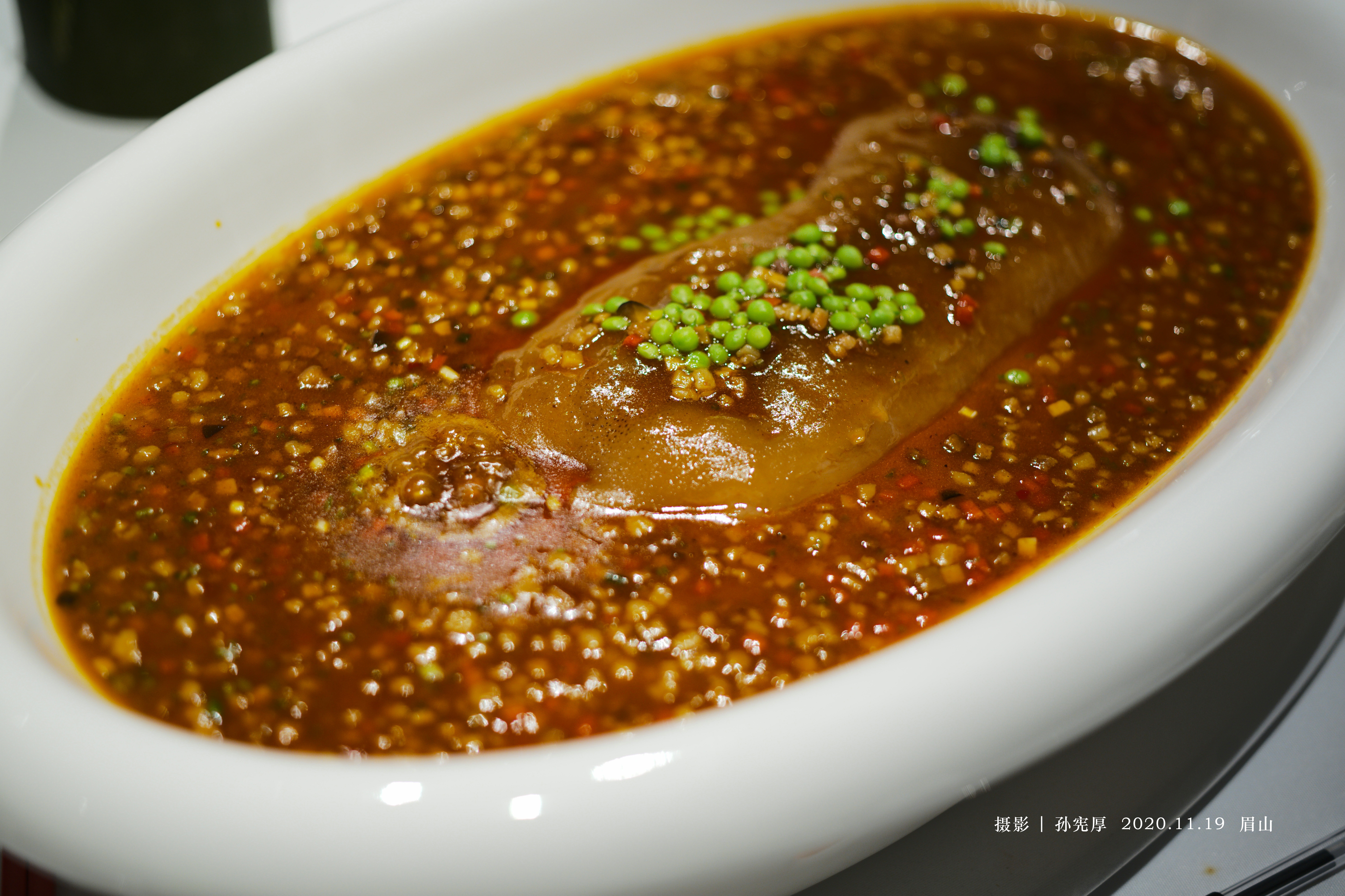 眉州东坡的东坡肘子,有古风豪气。肘子经过文火慢煨,肥肉弹牙不腻口,而瘦肉酥软,味醇汁浓,入口香糯。苏东坡曾自嘲“自笑平生为口忙”,政治上的失意,一生挫折和生活上的困顿,也是东坡大幸。苏东坡才所以成为苏东坡。