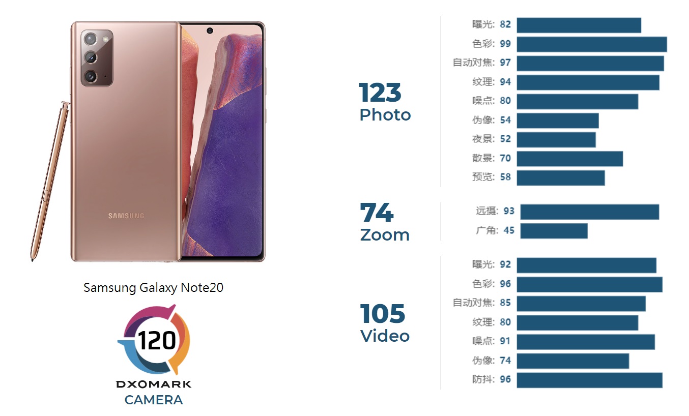 根据 DXOMARK 描述,三星 Galaxy Note 20 在所有测试中都展现了坚实的实力,静态摄影评分 123 分,其曝光效果通常非常出色,颜色性令人赏心悦目,在高对比度场景中也可以拍出宽广的动态范围。此外,预览图像质量也是 Note 20 的一大优势,屏幕显示准确,但是HDR实时预览有所欠缺。视频方面,Note 20 整体表现称职,防抖有效,对焦速度很快,动态范围广。但是振铃效应明显,高频区域有混叠和摩尔纹,纹理表现稍弱。低光照视频拍摄噪点控制良好,看起来干净。