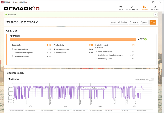 PCMark 10主要包括了常用基本操作,比如开启应用程序、视频会议、网页浏览;生产力包括测量系统性能与日常办公应用程序,测试工作负载包括文档编写和电子表格;数位内容创作测试组合反映了操作数位内容和媒体的工作需求,测试工作负载包括照片编辑,视频编辑和渲染与视觉化。这款尊爵 Prestige 14 EVO在该项的综合得分为4537,而且在生产力和数位方面的性能表现也足够优秀。