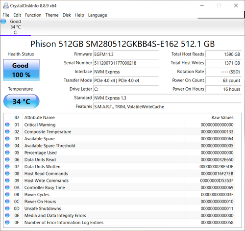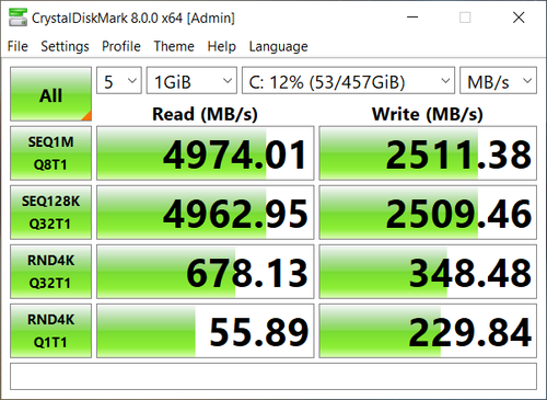 除了核心硬件之外,这款笔记本还搭载了16GB (16G*1) LPDDR4X-4267,更加有助于核显的性能释放。硬盘则搭载了512GB PCIe NVMe固态,我们评测的这款硬盘顺序读取速度达到了4974MB/s,写入速度2511MB/s,这对于系统和程序的快速启动和加载有着直接的影响。