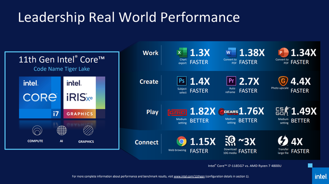 实际上,在11代酷睿处理器发布之时,英特尔就表示,搭载了锐炬Xe显卡的11代酷睿处理器,在办公文档、创作、游戏和连接等方面,相对于锐龙7 4800U都有更加优秀的表现。