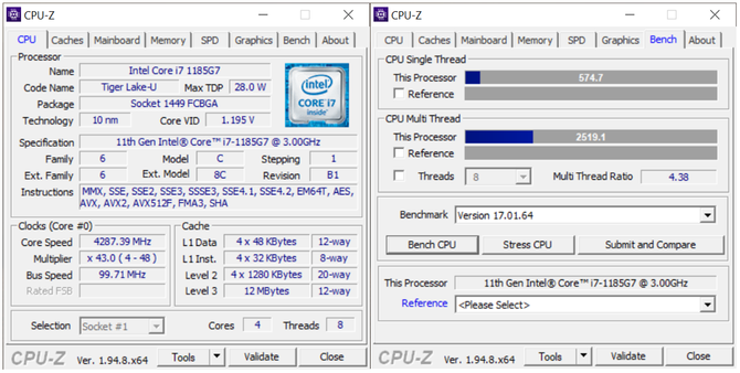 尊爵 Prestige 14 EVO搭载了第11代智能英特尔酷睿i7-1185G7处理器,10nm制程工艺,4核心8线程,最高加速频率可达4.80GHz。相较于上一代i7-1065G7,除了频率上的提升,i7-1185G7还增加了缓存容量,三级缓存从8MB提升到12MB,增加了50%,这也是第11代酷睿处理器IPC提升的关键要素之一。TDP (PL1)15W,最大28W,通过CPU-Z也可以看到这款笔记本已经全部解锁达到最大,运行基准测试,单核得分574.7,多核得分2519.1,无论是频率还是缓存上的提升都是有效的。