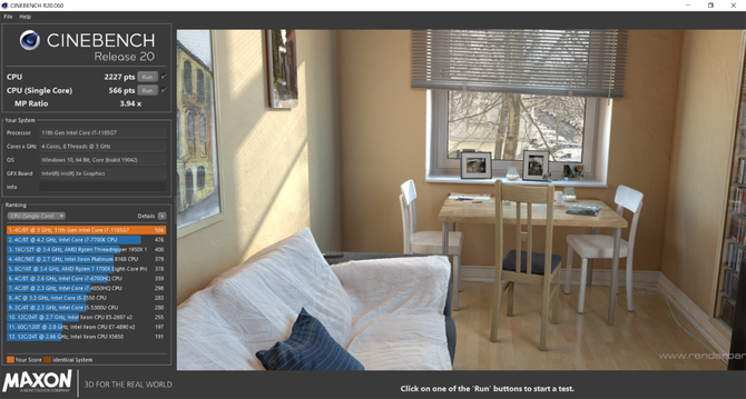 CineBench R20能够考验处理器在图像渲染计算能力,i7-1185G7的单线程分数为566pts,多线程得分2227pts。单线程分数甚至超越了所有的桌面处理器,果然性能非凡。