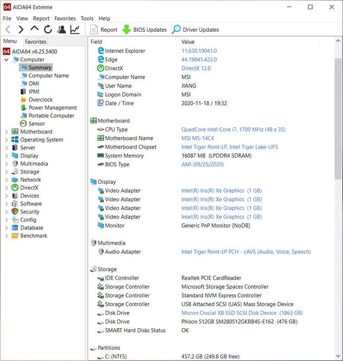 需要说明的是,本文评测的尊爵 Prestige 14 EVO来自国外,预装Windows 10 Home英文版,所以我们测试的工具也均采用了英文版,测试的环境为办公室,正常室温约24°C。具体的配置如下: