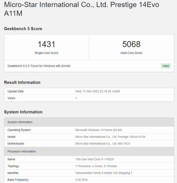 Geekbench 5主要针对处理器进行综合能力的测试,11代酷睿i7-1185G7处理器在这款笔记本上的最终成绩,单核性能评分1431,多核性能评分5068。