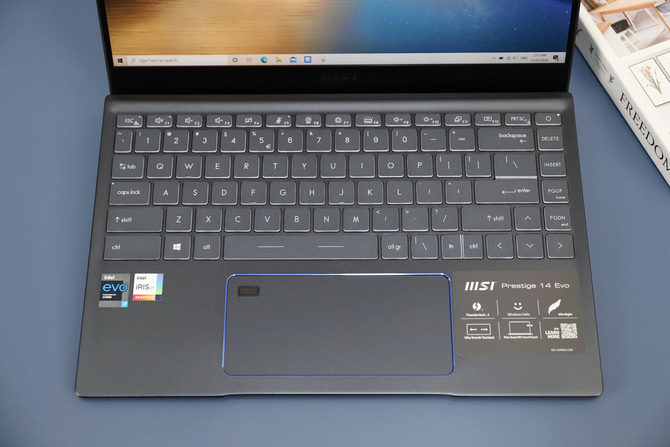 由于机身体积小巧,所以微星尊爵 Prestige 14 EVO的C面键盘看上去比较紧凑,实际上是两边框更窄了,但是键盘依然是全尺寸,按键的间距也有所增加,配合1.5mm键程,敲击体验还是比较舒适,此外,键盘还配备了可调LED背光灯,即便在光线比较暗的环境中,也能有效避免误触情况的发生。掌托中间是一个很大的触控板,同样采用了蓝色钻切,与A面的边缘想呼应。触控板的左上角还配备了指纹识别模块,快捷而安全。