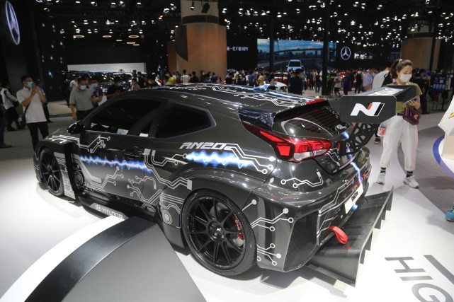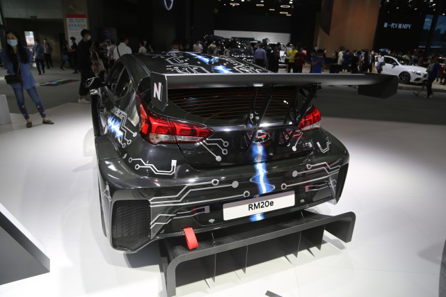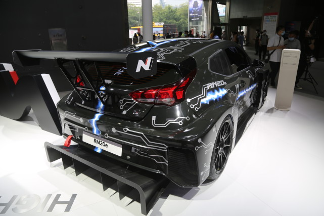 现代RM20e纯电动赛车,拥有810马力的最大功率和960牛·米的峰值扭矩;车尾部分尺寸硕大的后扰流板和扩散器,视觉效果富有冲击力。