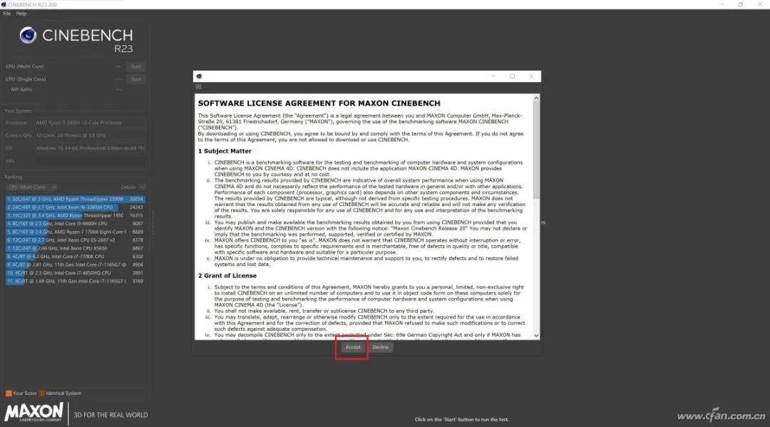 CINEBECH R23的主界面和R20没啥区别,启动后点击授权说明下方的“Accept”,就进入了测试界面。它默认就是类似R20高级测试的单核、双核、多核效率界面,而新的高级测试选择则是多了个测试方式设定,可以选择默认的10分钟、测试稳定度的30分钟或关闭时间设定,即和R20一样一遍测试出成绩。