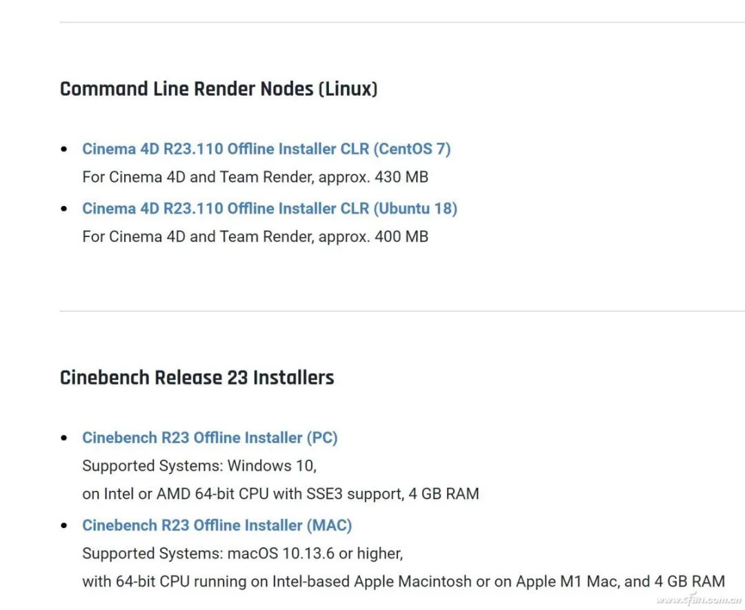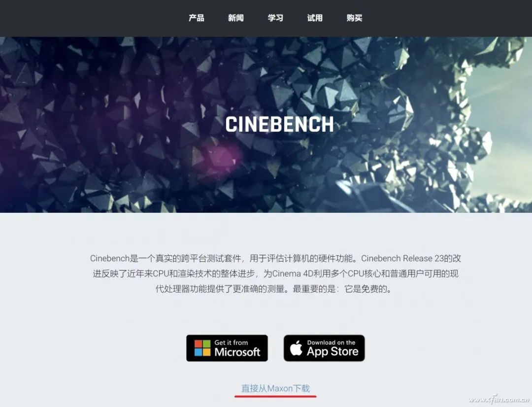 ,在弹出的页面中建议选择“直接从Maxon下载”。之后要注意,我们再次回到了一个综合页面,排在前面的是Cinema 4D等软件的下载链接,必须向下翻页才能找到CINEBENCH R23的下载链接,点击“Cinebench R23 Offline Installer (PC)”下载即可。