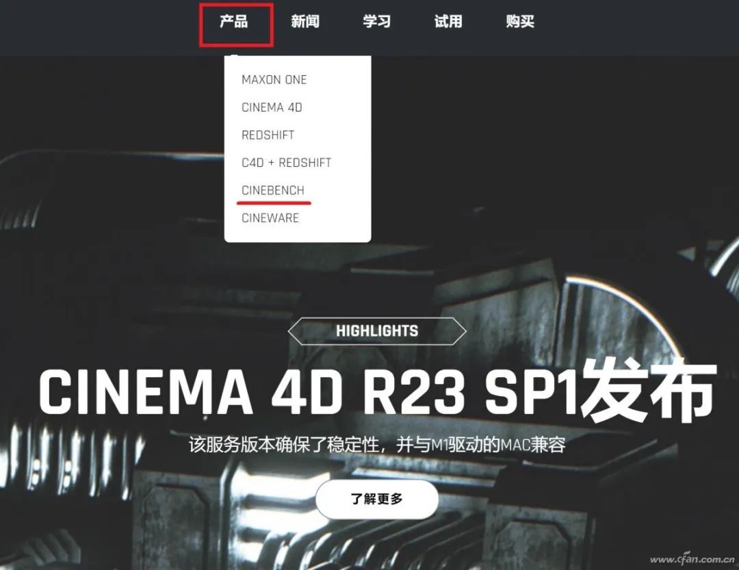 CINEBENCH的另一大优点是免费易用,小伙伴们都可以下载来验证一下网上的测试。而其他基于真实软件的测试程序,比如3DMark、PCMark、SYSMark等等则大都价格不菲,只能看看别人的测试成绩,多少有点无聊。想要试一下的小伙伴们需要先打开https://www.maxon.net,点击顶部的“产品”,选择“CINEBENCH”