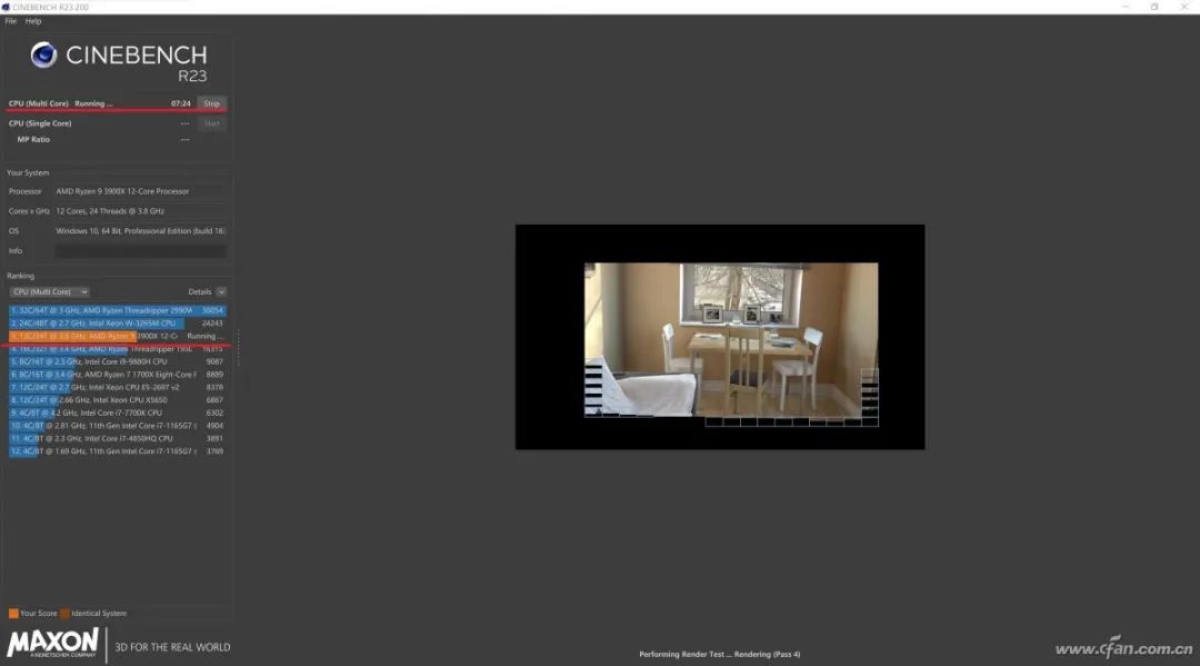 测试方式也有了一点变化,没有全面测试按键,用户需要自己分别点击多核、单核测试后的“Start”按键进行测试。测试过程仍然是渲染一张起居室的效果设计图,但是测试变成了按照时间进行,虽然第一遍后就有了基本的成绩,可以看到排行,但必须等到10分钟测试完成后才会给出准确分数。