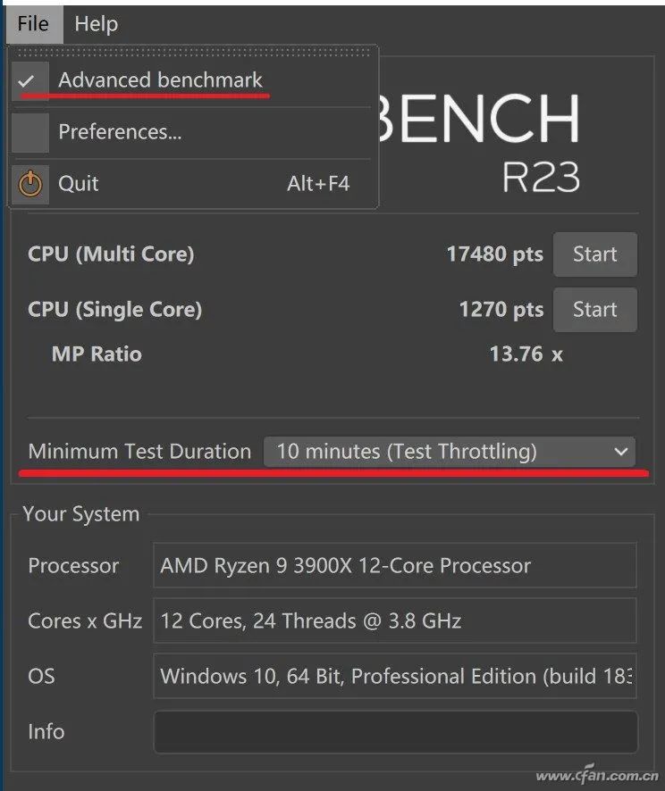 要想深入测试的话,还可以点击界面顶部的“File→Preference”,呼出测试偏好设置,主要是自定义线程数量和测试时间,比如小编想看看同样是20个线程的时候,锐龙9 3900X和酷睿i9-10900K谁更强一些,就可以把24线程的锐龙9 3900X强制设置为20个线程运行。