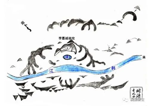 再看前砂。表面上,韩江东面的凤凰山脉,至少排列有四、五重朝山。但实际上,除靠江一重为李氏祖坟前列外,余皆它向,且分割而不连贯。即使前朝一列,也还是相曳而去,南北顾盼。大江远隔,若同属一个山系,有情者尚可为应,相曳则大减分数。
