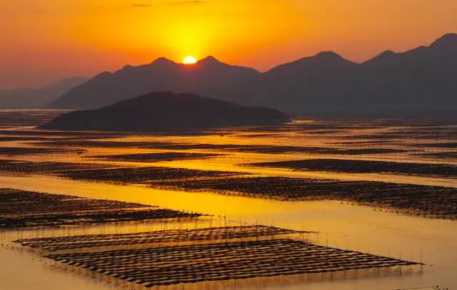 霞浦的美,像一幅山水水墨画,日落时分尤为最美,晚霞和水面相映成章,天光云影共一色,层层叠叠,十分柔美。