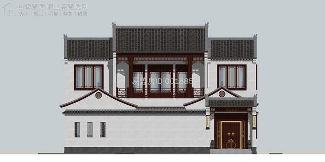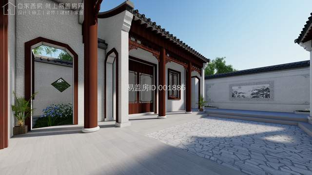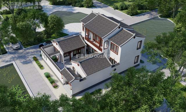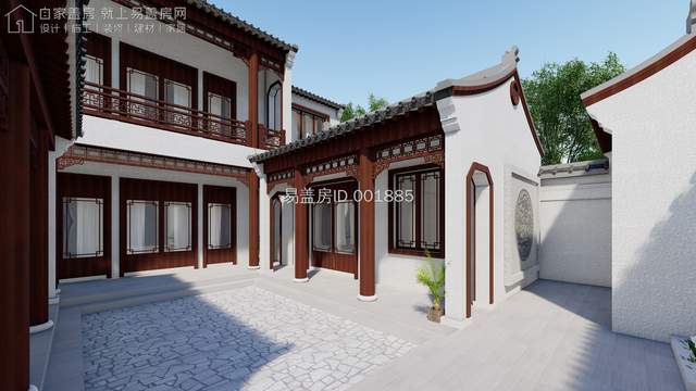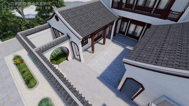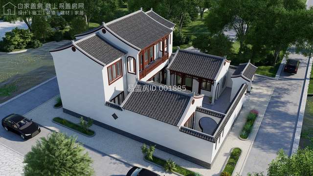 建筑为三合院形式,立面采用白色真石漆搭配深色古建青瓦,设计师通过古建窗花、雀替等中式元素,让整体展现出独有的复古韵味。
