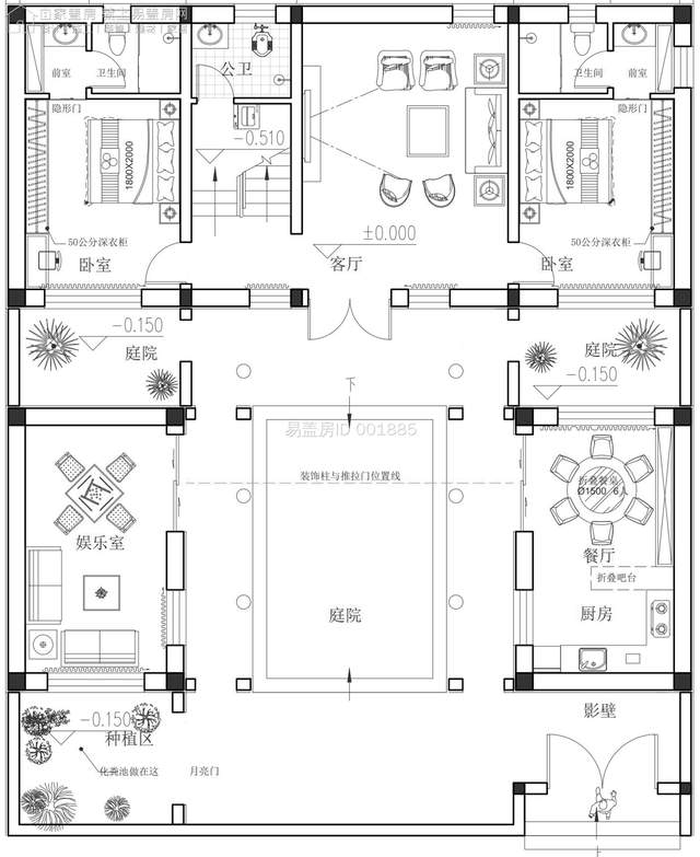 院落从东西侧进入,整体功能划分明确,主房入户位于南侧,规划出了待客和居住空间;西厢房设置了较大面积的娱乐室空间,东厢房为餐厨空间。