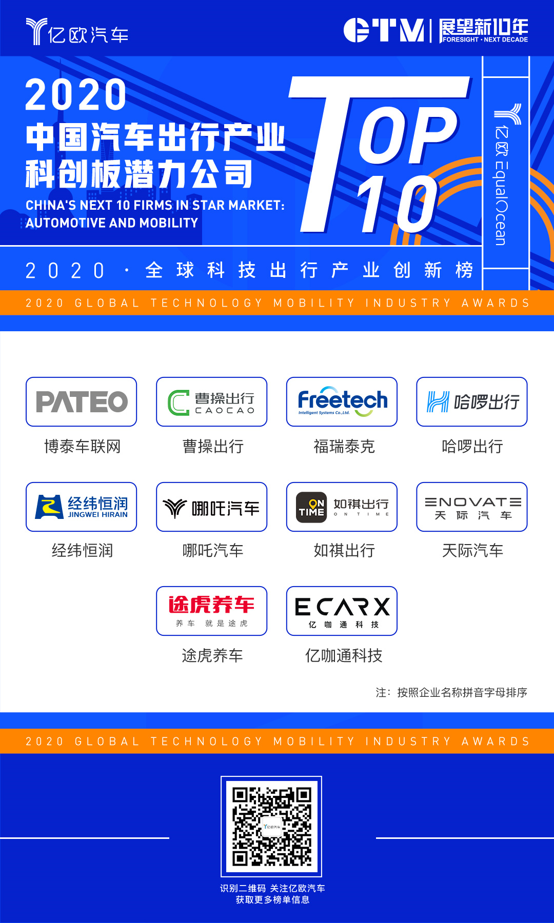 亿欧汽车发布《2020中国汽车出行产业科创板潜力公司TOP10》榜单
