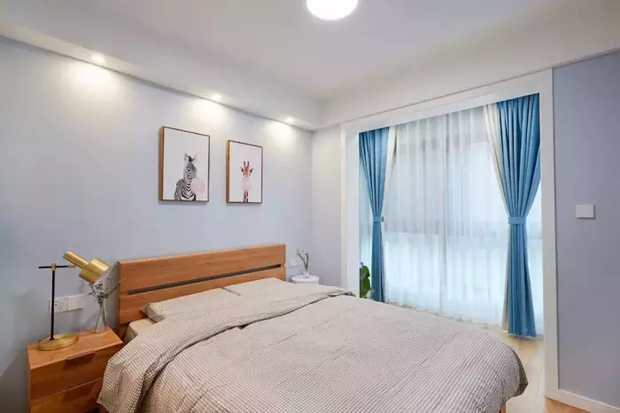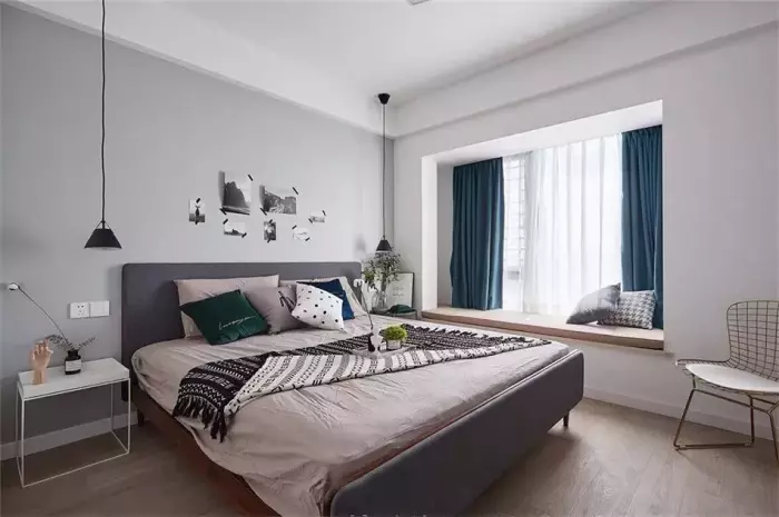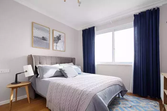 最为简单的当然就是刷上白色的漆,白色的墙面搭配蓝色的窗帘、原木色的床和浅灰色的床品,整体给人简约范的感觉,又不会太过单调。
