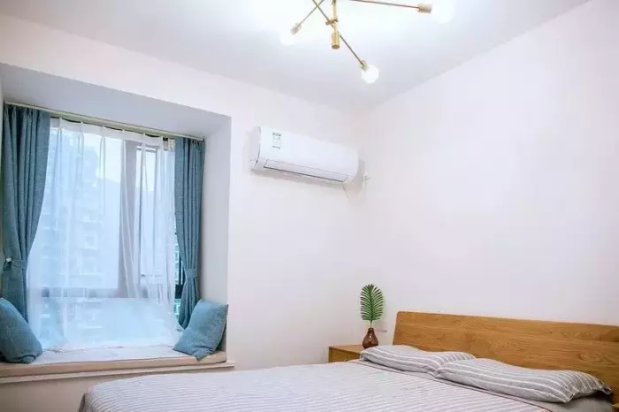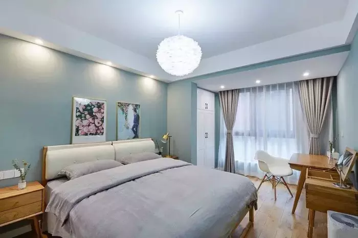 和蓝色相近的就是青色、绿色系,对于卧室来说,青色、绿色搭配原木风的床、家具等,会让卧室更加清新、自然,充满了活力。