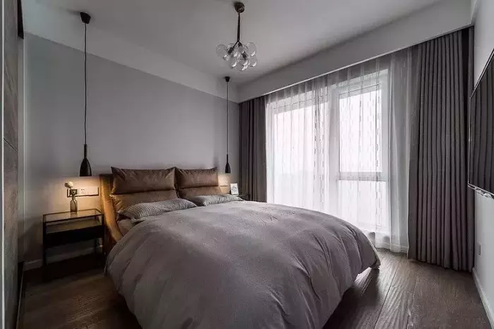 灰色系也是比较流行的一种卧室设计方案,灰色的墙面、床品和窗帘,整个空间都布满了高级灰,让卧室看起来有格调多了。