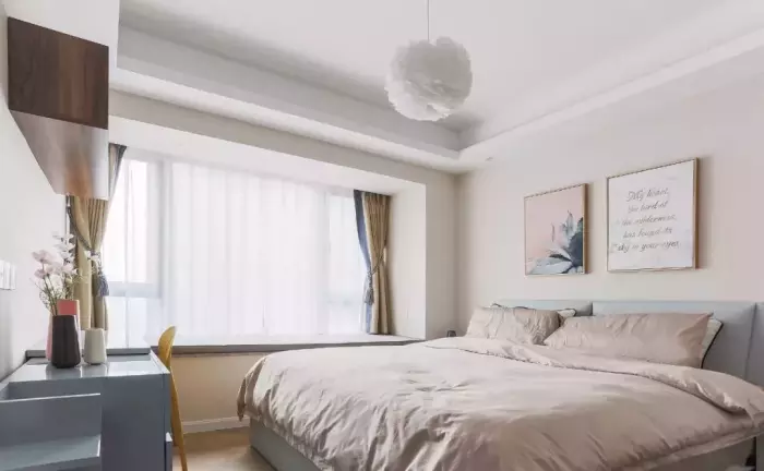 和白色比较接近的是米色系的,比如米白色、米黄色等,米白色的卧室会更为明亮一些,又有着米色的柔和、舒适的感觉。