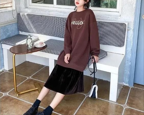 休闲的卫衣与优雅的百褶,二者好像两条永不相交的平行线,但是这样的穿搭真的很奇妙!长卫衣与时尚百褶纱裙拼接在一起,俏皮可爱中不失活力与动感。