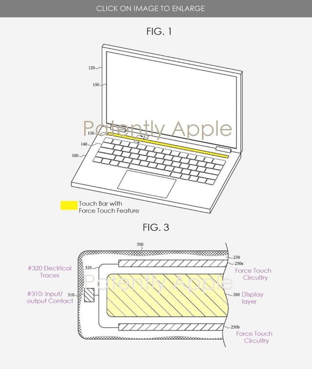 在专利文件中,Touch Bar的尺寸与现款的机器无异,压力感应的技术实现方案与此前苹果在iPhone、Apple Watch与触控板上用到的一样。