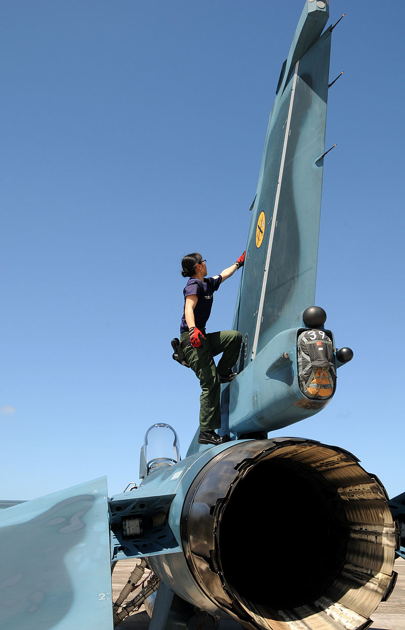 女地勤在检查F-2垂尾,垂尾根部的方舱塞着减速伞
