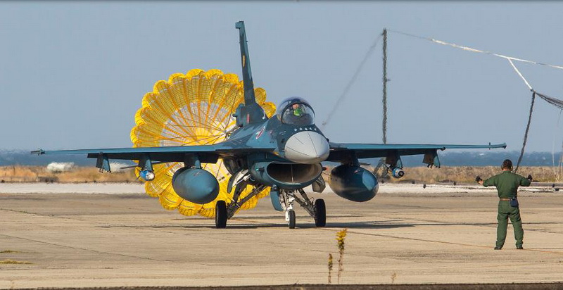拖着减速伞滑行的F-2