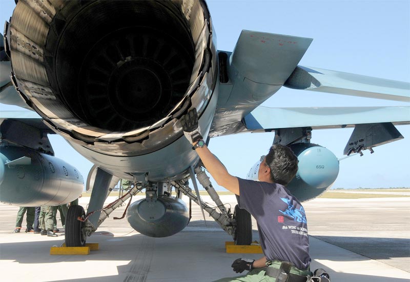 地勤人员在检查F-2的发动机