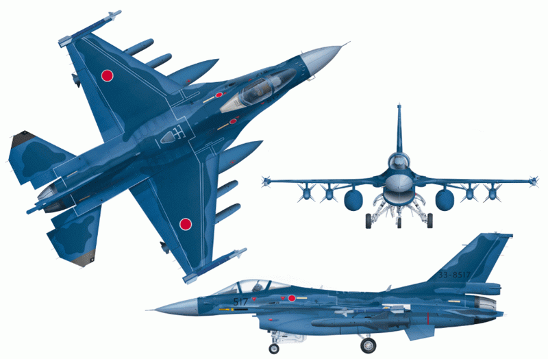 F-2和F-16一样,单发单垂尾,机身下椭圆进气口布局。单座型F-2A虽然被称为支援战斗机,但对空对海和对地作战能力已经比F-1有很大提高。双座型F-2B除担负教练任务也具有作战能力。