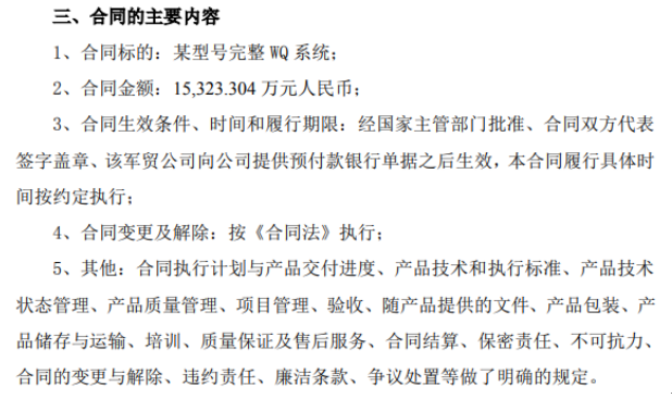本次签署的合同为公司完整WQ系统继首次实现小批量军贸订货之后的又一次批量采购。目前公司已完成多款完整WQ系统型号产品的出口立项审批,后续公司将密切结合国际市场需求,持续积极推进完整WQ系统产品的军贸科研出口工作。
