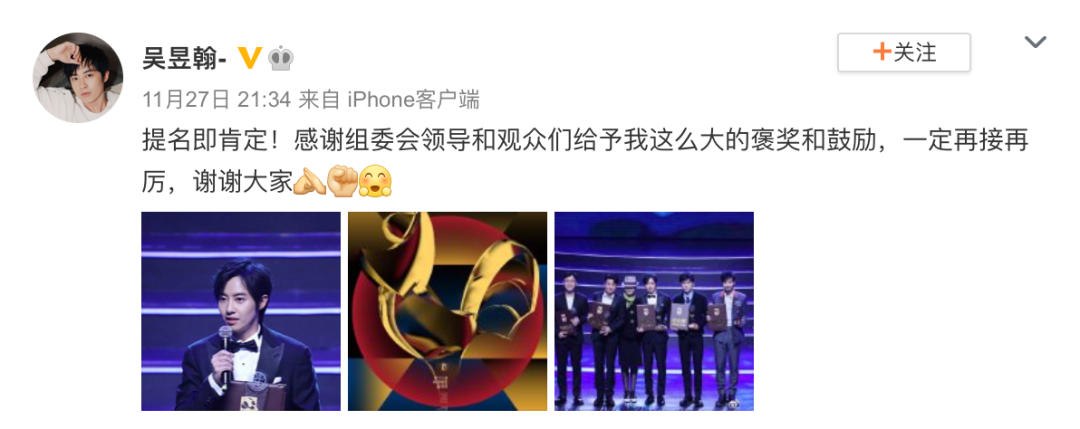 此次入围金鸡最佳男主,既是对于吴昱翰的认可,也是对于他的激励,他自己也在微博上谦虚地说“提名即肯定,一定再接再厉”。毕竟未来道路还很长,吴昱翰的未来可能还有无限大。