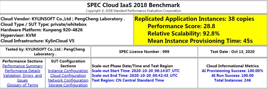 近日,SPEC 官网公布了最新 SPEC CLOUD IAAS 2018 测试排名。麒麟软件官方表示,由鹏城实验室和麒麟软件共同提交的基于银河麒麟云 V5 版本的 “鹏城生态”开发者云的测试结果,从去年同期的 8.4 分提升至 28.8 分,可扩展性也从 81.7% 提升至 92.8%,综合得分超过排名榜单内同规模的 x86 云平台成绩,取得了云计算性能全球 SPEC CLOUD 排名第一的好成绩。