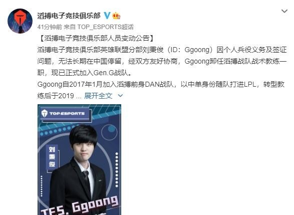 【CNMO新闻】11月30日,滔搏电子竞技俱乐部正式官宣,英雄联盟分部刘秉俊ID:Ggoong因个人兵役义务及签证问题,无法长期在中国停留,经双方友好协商,Ggoong卸任滔搏战队战术教练一职,现已正式加入Gen.G战队。无论是以选手还是以教练的身份,Ggoong对滔搏的贡献与付出都值得认可。