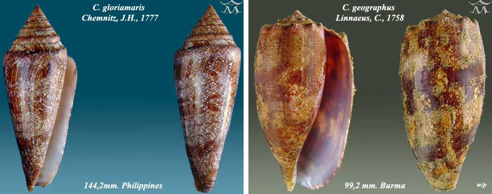 海之荣光芋螺(左)和地纹芋螺(右)。| Almed2 / wikimedia