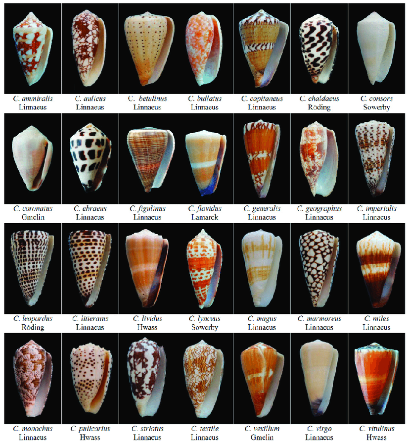 不同种类的芋螺。来猜猜它们的食性吧。| Cheng Li, et al. / Marine Drugs (2018)
