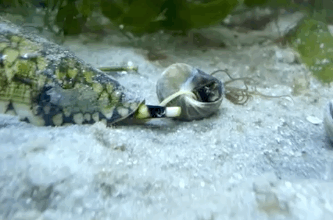 话虽如此,大理石芋螺仍然是一名优秀的猎手,因为它熟练掌握着一套必杀技——“放毒箭”。与其他芋螺一样,大理石芋螺的吻管中藏有一个高度特化成鱼叉状的齿舌。捕食时,它先伸出细长的吻管探测食物方位;接近目标后,它便以极快的速度用齿舌射穿目标的皮肤,毒液也随之注射到目标体内,使其在很短时间内麻痹从而失去活动能力。整个过程速度之快,肉眼几乎无法看清,就连被捕食的对象也往往是在无意识中便陷入了昏迷——某种程度上,这也算是一种“安乐死”吧?