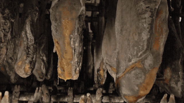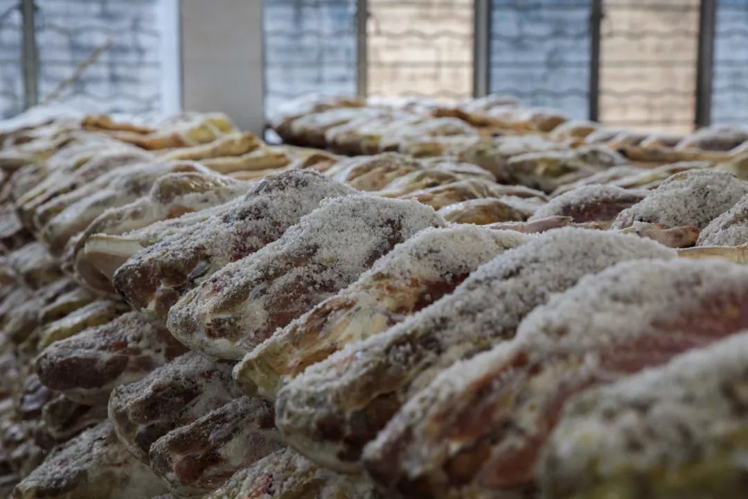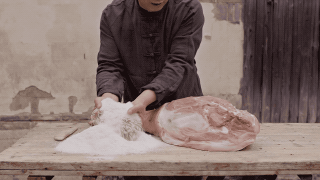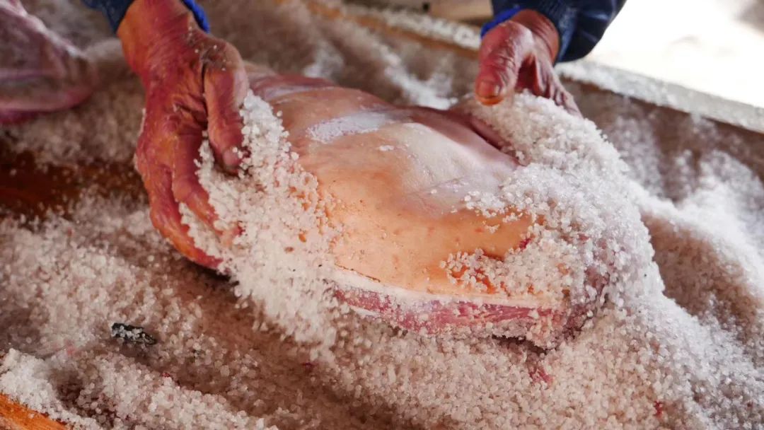 上盐是决定火腿风味的第一步,根据腿的大小、厚薄,将粗盐均匀地洒在火腿上,第一次上盐叫“出水盐”,第二次叫上大盐,在接下来的一个月时间,需要上5~6次盐。