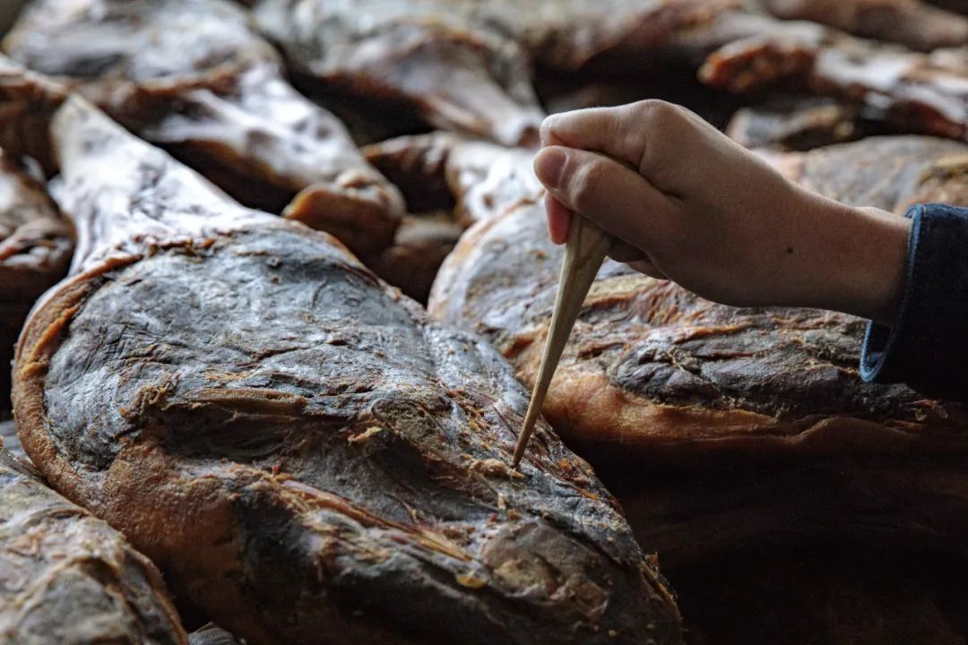 熟成好的火腿,还需经过最后一道检验:打签闻香,经验老道的师傅采用传统的“三签香”方法。