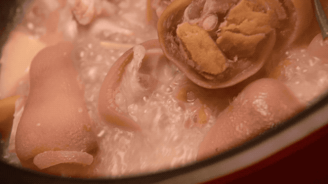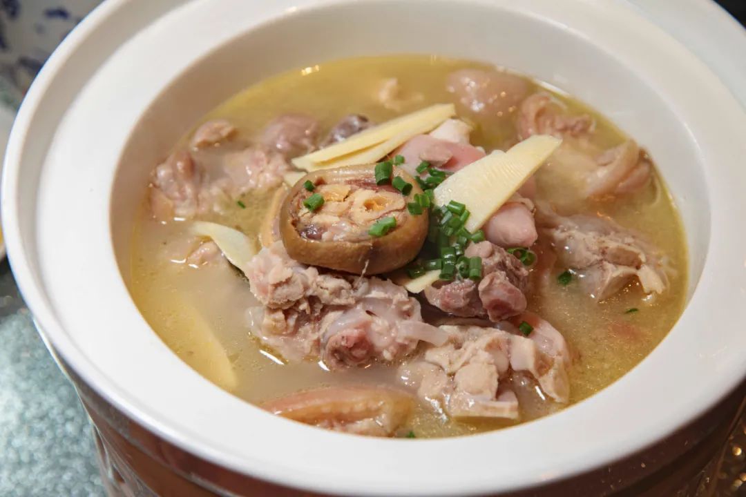 火腿搭配猪蹄膀,再加入应季的冬笋,口感鲜咸、酥烂、肥而不腻,爪皮上的胶原蛋白充足,满满的胶质几乎要粘腻到上颚。