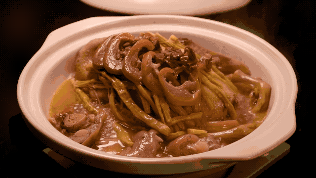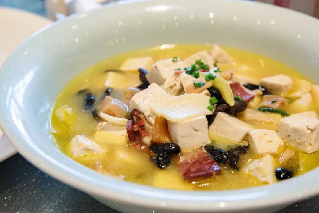 最后一道,盐卤豆腐与火腿的滴油老火慢炖,不仅可有效去除豆腥味,还令豆腐愈发滑嫩,在充分吸收火腿的油脂和醇香后,再辅以少许冬笋片、辣椒等食材,越炖越入味。