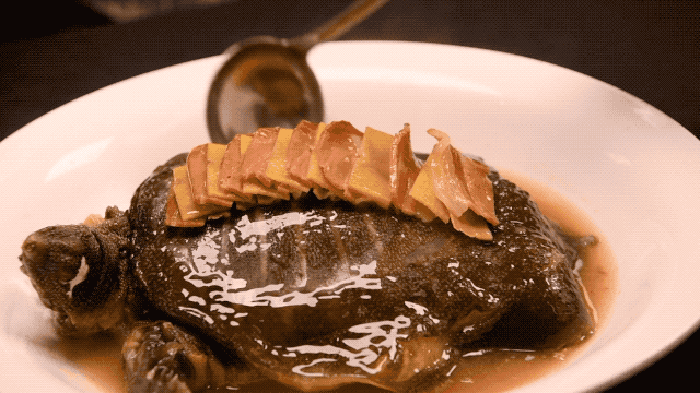 这道上方火腿蒸甲鱼,选用火腿的上方切成薄片,与甲鱼一起慢火蒸制,令火腿的醇旨和甲鱼的鲜美充分融合,汤厚胶浓、肉质酥嫩、裙边滑润。成就了口感细腻、食材相得益彰的滋补体验。